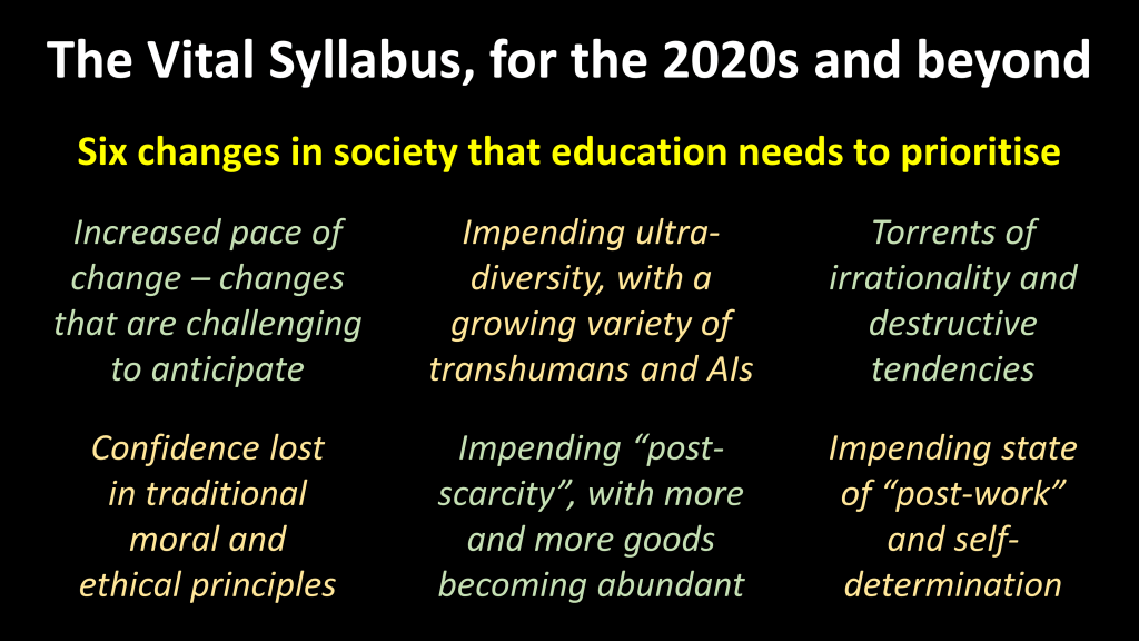 The concept of the Vital Syllabus was introduced in the book Vital Foresight, published in June 2021. One of the key themes in that book was the urgent need to radically transform education. Improving the practice of education is an essential prerequisite to improving the future of humanity.